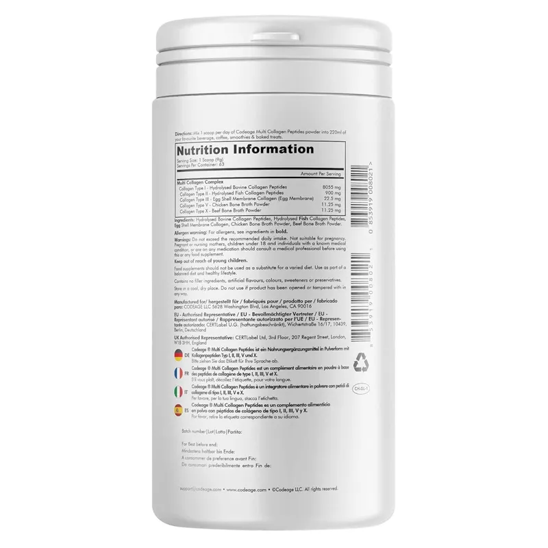مکمل Multi Collagen Protein از برند Codeage، یک مکمل منحصر به فرد است که ترکیبی از پنج نوع کلاژن (نوع I، II، III، V و X) را ارائه میدهد. این محصول با فرمولاسیون خاص خود، حاوی پپتیدهای کلاژن هیدرولیز شده است که از منابع غذایی با کیفیت بالا مانند کلاژن گاوی تغذیه شده با علف، کلاژن استخوان مرغ و گوشت، کلاژن ماهی وحشی و کلاژن پوسته تخممرغ تهیه شده است. این مکمل حاوی ۱۸ آمینو اسید بوده و فاقد کربوهیدرات است. همچنین، این مراقبت پوست و مو غیرتراریخته (Non-GMO)، بدون گلوتن، بدون لبنیات و بدون سویا بوده و با رژیمهای کتو و پالو سازگار است. با سهولت در استفاده روزانه، این پودر میتواند به راحتی به انواع غذاها و نوشیدنیها اضافه شود.
